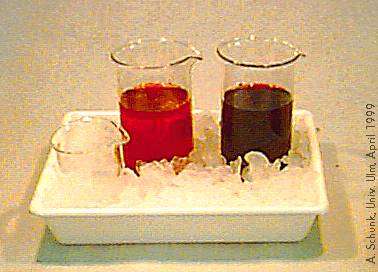 Die diazotierte Sulfanilsäure-Lösung auf beide Bechergläser